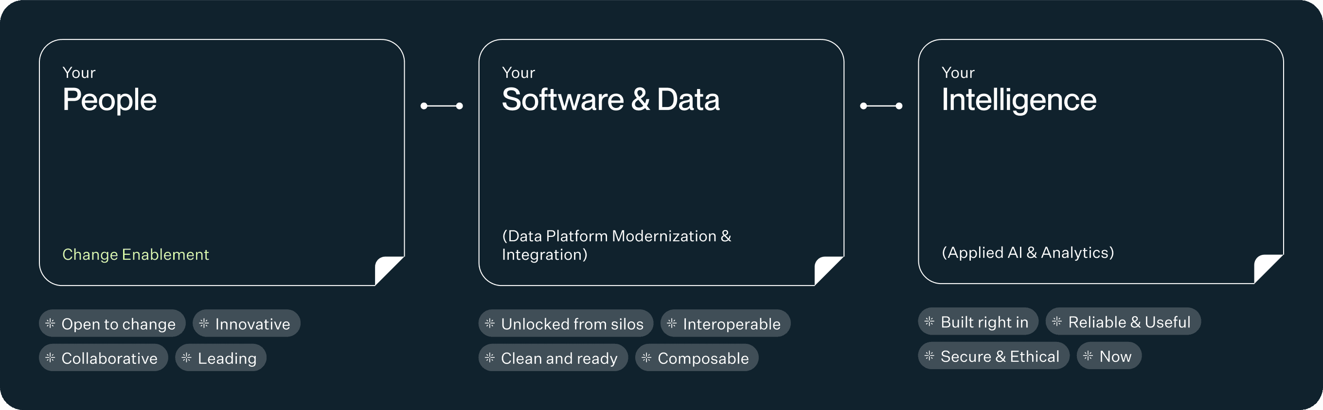 We build your modern digital core, lower costs, increase growth, all while reducing AI risk. Replace slide decks and vague promises with working software AI strategy, data platform modernization, and systems integration that are delivered with clear checkpoints and measurable ROI.
